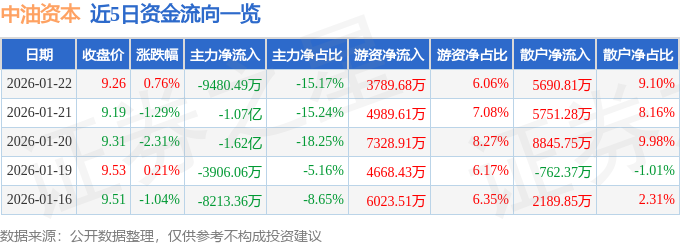 证券之星消息,截至2026年1月22日收盘,中油资本(000617)报收于9.26元,上涨0.76%,换手率0.53%,成交量67.42万手,成交额6.25亿元。