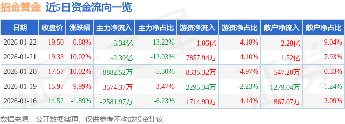 证券之星消息,截至2026年1月22日收盘,招金黄金(000506)报收于19.5元,上涨0.88%,换手率14.25%,成交量132.33万手,成交额25.28亿元。