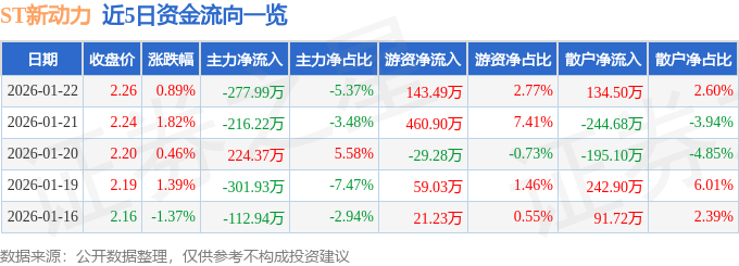 证券之星消息,截至2026年1月22日收盘,ST新动力(300152)报收于2.26元,上涨0.89%,换手率3.24%,成交量23.1万手,成交额5180.39万元。