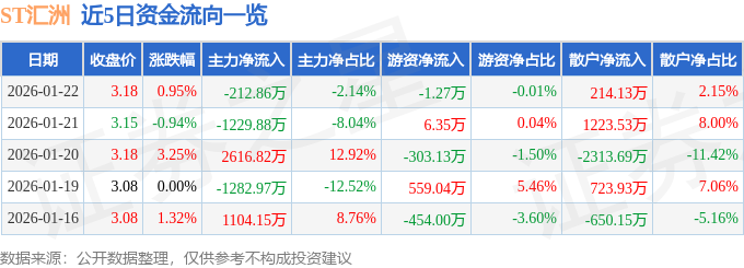 证券之星消息,截至2026年1月22日收盘,ST汇洲(002122)报收于3.18元,上涨0.95%,换手率1.58%,成交量31.43万手,成交额9958.1万元。