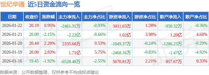 证券之星消息,截至2026年1月22日收盘,世纪华通(002602)报收于20.19元,上涨0.95%,换手率1.94%,成交量132.15万手,成交额26.57亿元。