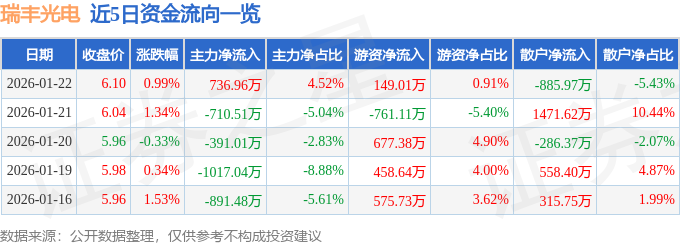 证券之星消息,截至2026年1月22日收盘,瑞丰光电(300241)报收于6.1元,上涨0.99%,换手率4.58%,成交量26.85万手,成交额1.63亿元。