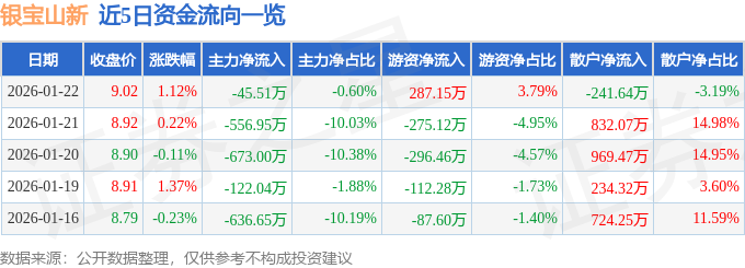 证券之星消息,截至2026年1月22日收盘,银宝山新(002786)报收于9.02元,上涨1.12%,换手率1.71%,成交量8.43万手,成交额7571.73万元。