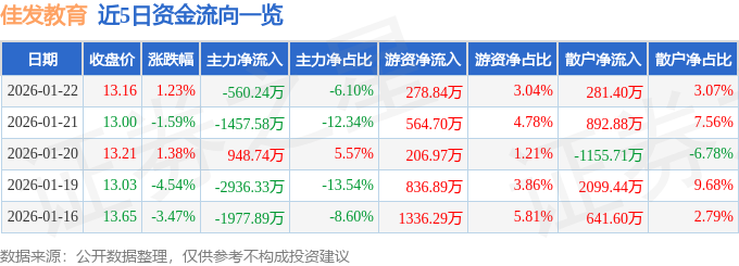 证券之星消息,截至2026年1月22日收盘,佳发教育(300559)报收于13.16元,上涨1.23%,换手率2.25%,成交量6.99万手,成交额9179.78万元。