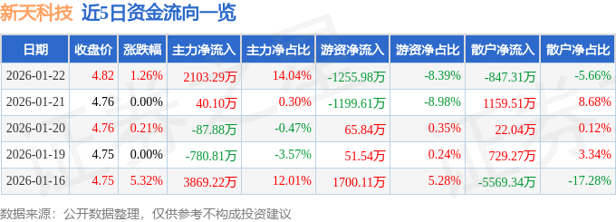 证券之星消息,截至2026年1月22日收盘,新天科技(300259)报收于4.82元,上涨1.26%,换手率2.69%,成交量31.41万手,成交额1.5亿元。