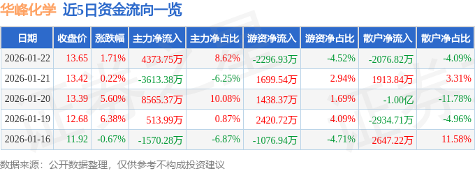 证券之星消息,截至2026年1月22日收盘,华峰化学(002064)报收于13.65元,上涨1.71%,换手率0.75%,成交量37.35万手,成交额5.08亿元。