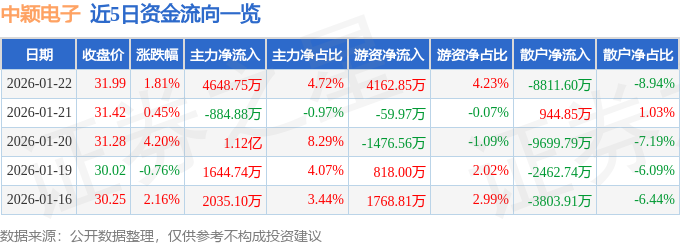 证券之星消息,截至2026年1月22日收盘,中颖电子(300327)报收于31.99元,上涨1.81%,换手率9.27%,成交量31.38万手,成交额9.85亿元。
