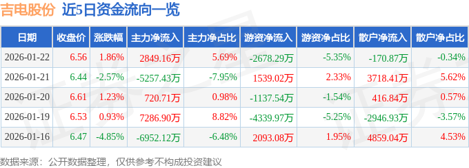 证券之星消息,截至2026年1月22日收盘,吉电股份(000875)报收于6.56元,上涨1.86%,换手率2.3%,成交量76.85万手,成交额5.01亿元。