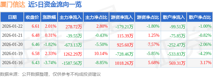 证券之星消息,截至2026年1月22日收盘,厦门信达(000701)报收于6.61元,上涨2.01%,换手率2.26%,成交量15.09万手,成交额9939.23万元。