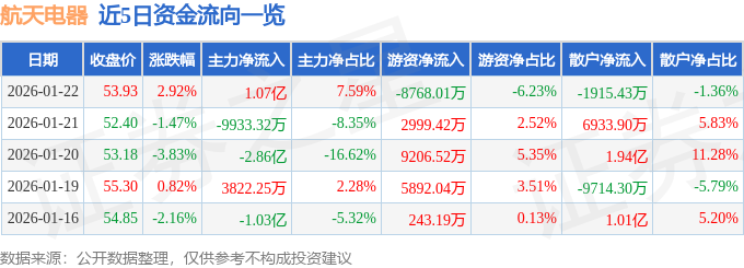 证券之星消息,截至2026年1月22日收盘,航天电器(002025)报收于53.93元,上涨2.92%,换手率5.77%,成交量26.19万手,成交额14.07亿元。