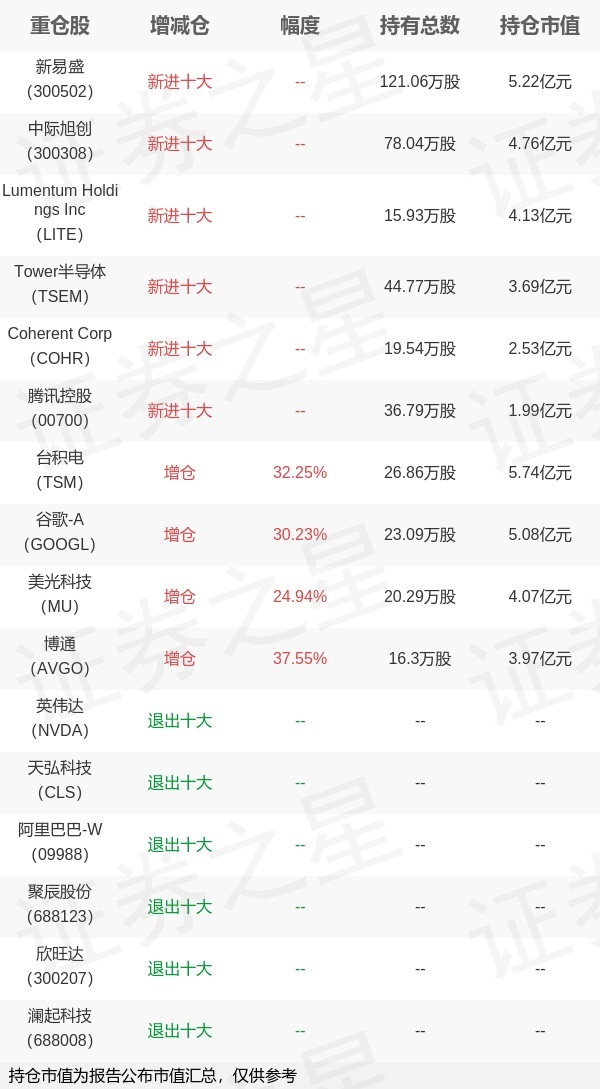 证券之星消息,1月22日易方达基金旗下郑希管理的易方达全球成长精选混合型基金(QDII)公布年报,近1年净值增长率88.01%。与上一季度相比,该基金前十大重仓股新增新易盛,中际旭创,Lumentum Holdings Inc,Tower半导体,Coherent Corp,腾讯控股;并对台积电增仓6.55万股,为该基金第一大重仓股;英伟达,天弘科技,阿里巴巴-W,聚辰股份,欣旺达,澜起科技等退出前十大重仓股;详细数据如下: