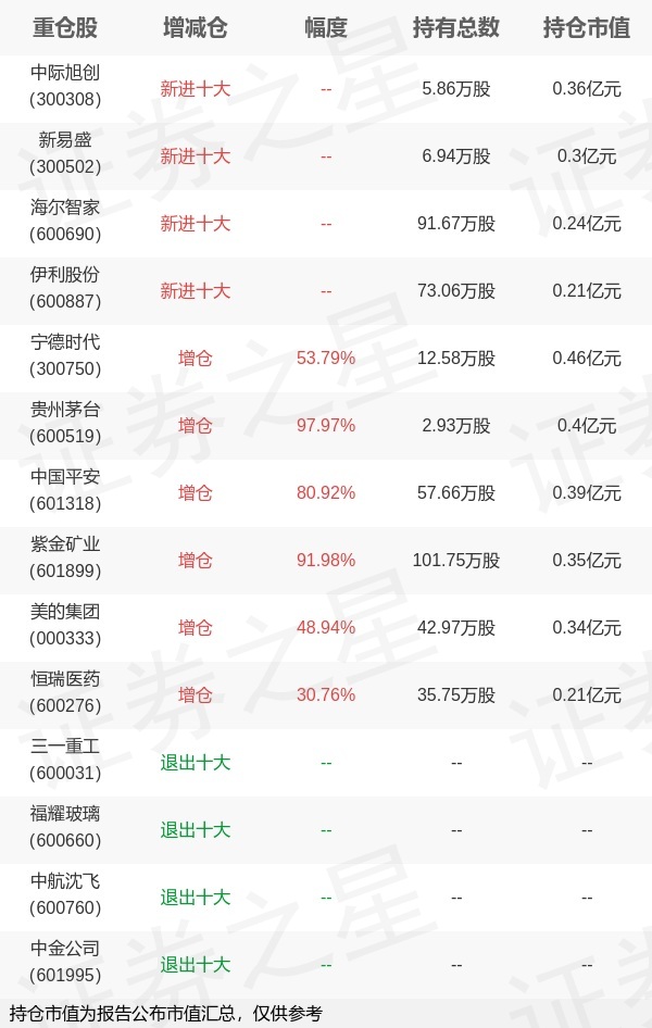 证券之星消息,1月22日富国基金旗下陈斯扬管理的富国宝利增强债券型发起式基金公布年报,近1年净值增长率8.75%。与上一季度相比,该基金前十大重仓股新增中际旭创,新易盛,海尔智家,伊利股份;并对宁德时代增仓4.4万股,为该基金第一大重仓股;三一重工,福耀玻璃,中航沈飞,中金公司等退出前十大重仓股;详细数据如下: