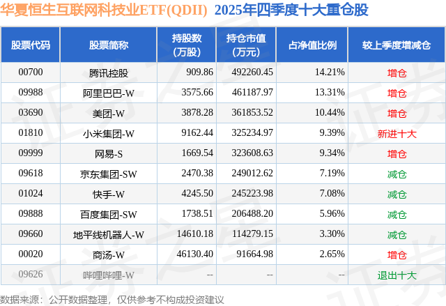华夏恒生互联网科技业ETF(QDII)基金成立于2021年1月26日,基金经理为徐猛,基金跟踪标的为恒生互联网科技业指数,成立以来超额回报为2.71%,近一个月超额回报为-0.62%。最新披露的基金持仓数据显示,截止2025年12月31日,该基金第一大重仓股为腾讯控股(00700),持股占比为14.21%。