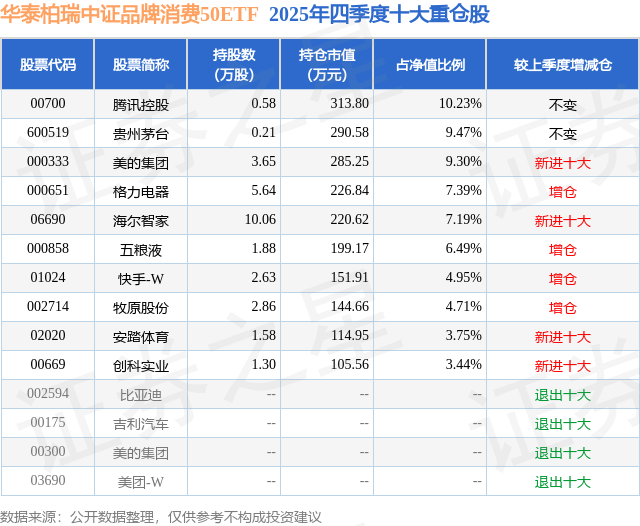 华泰柏瑞中证品牌消费50ETF基金成立于2021年11月17日,基金经理为陈柯含,基金跟踪标的为中证沪港深品牌消费50人民币指数,成立以来超额回报为3.27%,近一个月超额回报为0.31%。最新披露的基金持仓数据显示,截止2025年12月31日,该基金第一大重仓股为腾讯控股(00700),持股占比为10.23%。