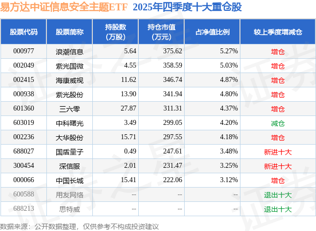 易方达中证信息安全主题ETF基金成立于2023年5月31日,基金经理为聂启文,基金跟踪标的为中证信息安全主题指数,成立以来超额回报为-1.49%,近一个月超额回报为-0.22%。最新披露的基金持仓数据显示,截止2025年12月31日,该基金第一大重仓股为浪潮信息(000977),持股占比为5.27%。
