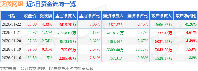 证券之星消息,截至2026年1月22日收盘,泛微网络(603039)报收于69.9元,上涨4.38%,换手率2.42%,成交量6.31万手,成交额4.37亿元。