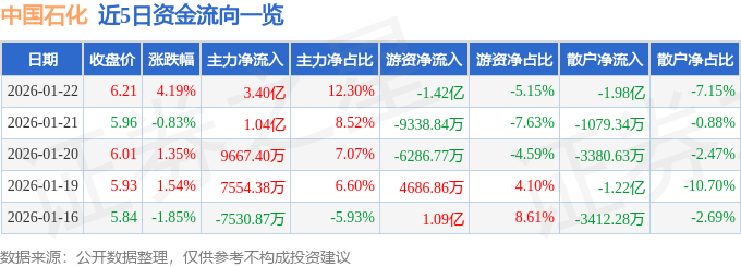 证券之星消息,截至2026年1月22日收盘,中国石化(600028)报收于6.21元,上涨4.19%,换手率0.47%,成交量449.05万手,成交额27.62亿元。