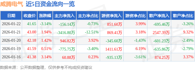 证券之星消息,截至2026年1月22日收盘,威腾电气(688226)报收于41.65元,下跌3.14%,换手率2.7%,成交量5.09万手,成交额2.14亿元。