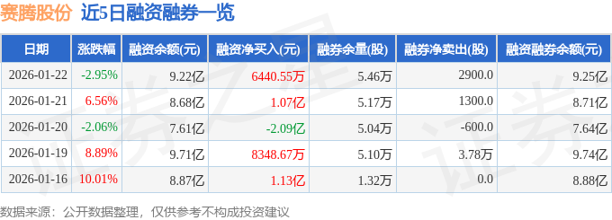 证券之星消息,截至2026年1月22日收盘,赛腾股份(603283)报收于54.19元,下跌2.95%,换手率9.91%,成交量26.87万手,成交额14.7亿元。