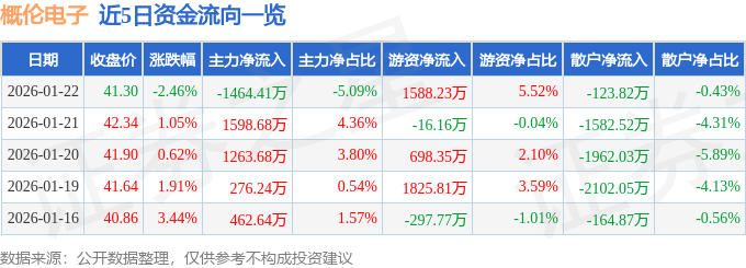 证券之星消息,截至2026年1月22日收盘,概伦电子(688206)报收于41.3元,下跌2.46%,换手率1.59%,成交量6.93万手,成交额2.88亿元。