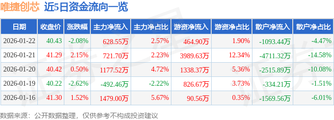证券之星消息,截至2026年1月22日收盘,唯捷创芯(688153)报收于40.43元,下跌2.08%,换手率1.48%,成交量6.03万手,成交额2.45亿元。