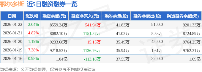 鄂尔多斯融资融券信息显示,融资方面,当日融资买入1518.45万元,融资偿还976.52万元,融资净买入541.94万元。融券方面,融券卖出2.6万股,融券偿还1.79万股,融券余量41.83万股,融券余额642.09万元。融资融券余额9201.33万元。