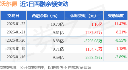 证券之星消息,1月22日,沃尔德(688028)融资买入2.17亿元,融资偿还1.14亿元,融资净买入1.03亿元,融资余额10.7亿元,当日融资净买入排名第45,近20个交易日中有12个交易日出现融资净买入。