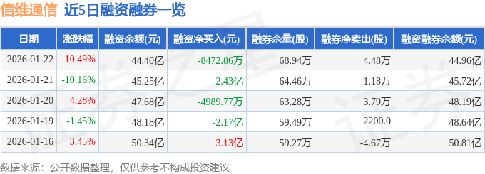 信维通信融资融券信息显示,融资方面,当日融资买入16.92亿元,融资偿还17.76亿元,融资净偿还8472.86万元。融券方面,融券卖出13.7万股,融券偿还9.22万股,融券余量68.94万股,融券余额5584.22万元。融资融券余额44.96亿元。