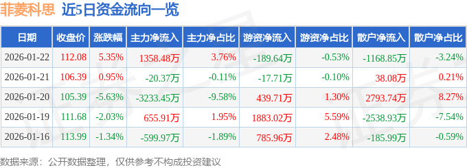 证券之星消息,截至2026年1月22日收盘,菲菱科思(301191)报收于112.08元,上涨5.35%,换手率6.27%,成交量3.27万手,成交额3.61亿元。