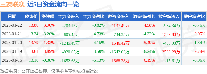 证券之星消息,截至2026年1月22日收盘,三友联众(300932)报收于13.86元,上涨3.9%,换手率7.95%,成交量18.12万手,成交额2.48亿元。