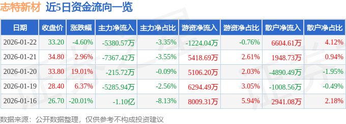 证券之星消息,截至2026年1月22日收盘,志特新材(300986)报收于33.2元,下跌4.6%,换手率11.66%,成交量48.0万手,成交额16.04亿元。