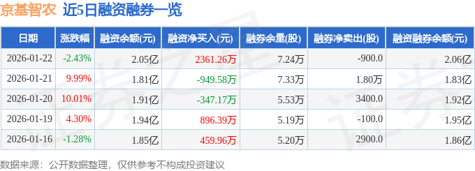京基智农融资融券信息显示,融资方面,当日融资买入6391.8万元,融资偿还4030.55万元,融资净买入2361.26万元。融券方面,融券卖出1400.0股,融券偿还2300.0股,融券余量7.24万股,融券余额130.68万元。融资融券余额2.06亿元。