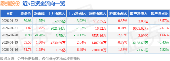 证券之星消息,截至2026年1月22日收盘,恩捷股份(002812)报收于50.96元,下跌1.75%,换手率3.52%,成交量28.98万手,成交额14.72亿元。