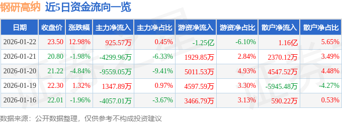 证券之星消息,截至2026年1月22日收盘,钢研高纳(300034)报收于23.5元,上涨12.98%,换手率11.68%,成交量89.56万手,成交额20.54亿元。