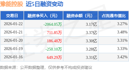 证券之星消息,1月22日,豫能控股(001896)融资买入3871.56万元,融资偿还5935.61万元,融资净卖出2064.05万元,融资余额3.17亿元,近20个交易日中有12个交易日出现融资净买入。