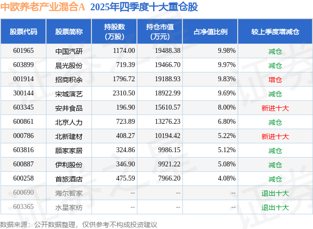 根据2025基金年报公募基金重仓股数据,重仓该股的公募基金共20家,其中持有数量最多的公募基金为中欧基金的中欧养老产业混合A。中欧养老产业混合A目前规模为13.64亿元,最新净值3.1744(1月22日),较上一交易日上涨0.35%,近一年上涨22.08%。该公募基金现任基金经理为许文星。许文星在任的基金产品包括:中欧创业板两年定开混合A,管理时间为2020年7月16日至今,期间收益率为3.68%;中欧睿见混合A,管理时间为2020年11月6日至今,期间收益率为-0.73%;中欧睿泽混合A,管理时间为2021年9月23日至今,期间收益率为-18.66%。