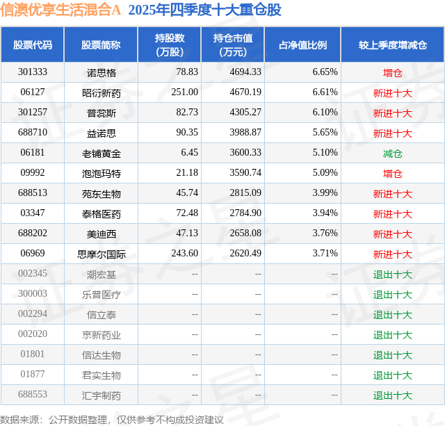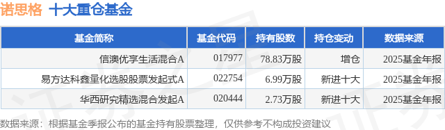 根据2025基金年报公募基金重仓股数据,重仓该股的公募基金共3家,其中持有数量最多的公募基金为信达澳亚基金的信澳优享生活混合A。信澳优享生活混合A目前规模为1.67亿元,最新净值1.1996(1月22日),较上一交易日上涨0.3%,近一年上涨57.84%。该公募基金现任基金经理为杨珂。