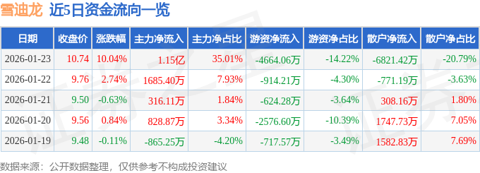 证券之星消息,截至2026年1月23日收盘,雪迪龙(002658)报收于10.74元,上涨10.04%,涨停,换手率8.81%,成交量31.6万手,成交额3.28亿元。