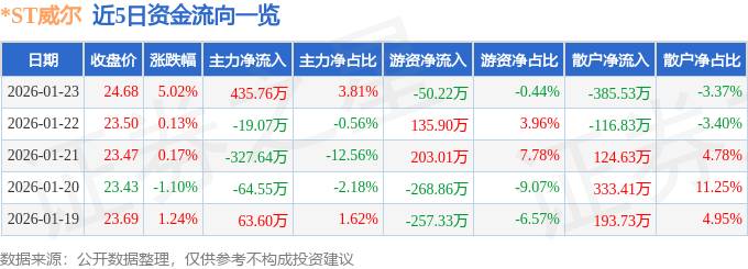 证券之星消息,截至2026年1月23日收盘,*ST威尔(002058)报收于24.68元,上涨5.02%,换手率3.26%,成交量4.66万手,成交额1.14亿元。