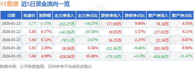 证券之星消息,截至2026年1月23日收盘,ST数源(000909)报收于5.77元,下跌1.37%,换手率0.71%,成交量3.1万手,成交额1796.46万元。