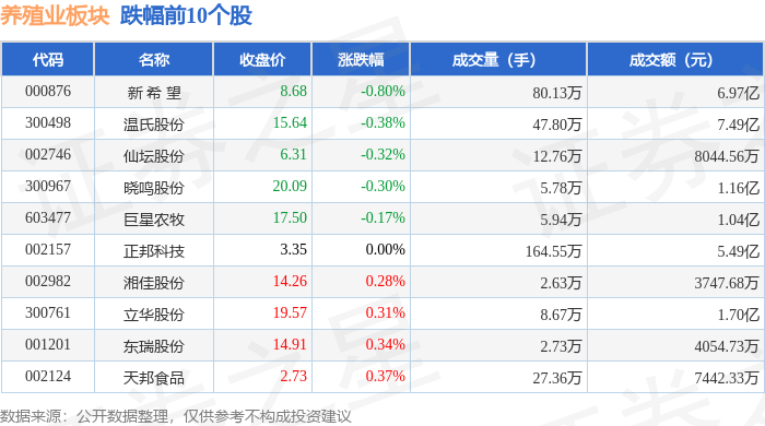 从资金流向上来看,当日养殖业板块主力资金净流出2.39亿元,游资资金净流出9866.12万元,散户资金净流入3.37亿元。养殖业板块个股资金流向见下表:
