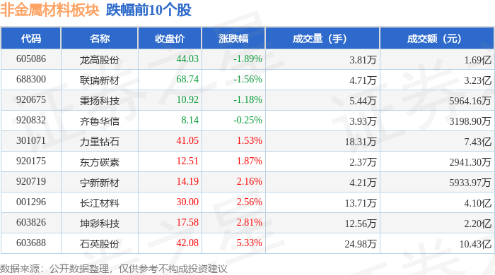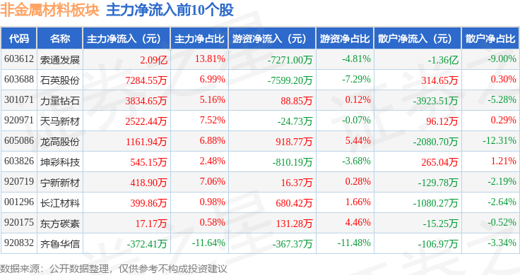 从资金流向上来看,当日非金属材料板块主力资金净流入3.28亿元,游资资金净流出1.38亿元,散户资金净流出1.91亿元。非金属材料板块个股资金流向见下表: