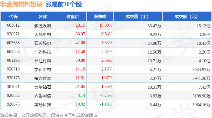 证券之星消息,1月23日非金属材料板块较上一交易日上涨3.15%,索通发展领涨。当日上证指数报收于4136.16,上涨0.33%。深证成指报收于14439.66,上涨0.79%。非金属材料板块个股涨跌见下表: