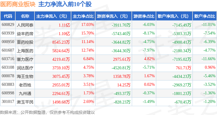 从资金流向上来看,当日医药商业板块主力资金净流入3.68亿元,游资资金净流出7400.56万元,散户资金净流出2.94亿元。医药商业板块个股资金流向见下表: