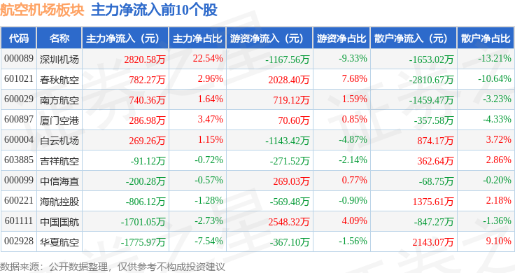 从资金流向上来看,当日航空机场板块主力资金净流出2.55亿元,游资资金净流入2.13亿元,散户资金净流入4227.19万元。航空机场板块个股资金流向见下表: