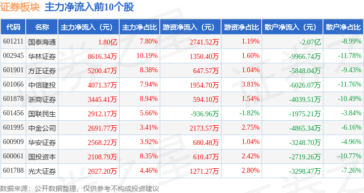 从资金流向上来看,当日证券板块主力资金净流出16.44亿元,游资资金净流入4.94亿元,散户资金净流入11.5亿元。证券板块个股资金流向见下表: