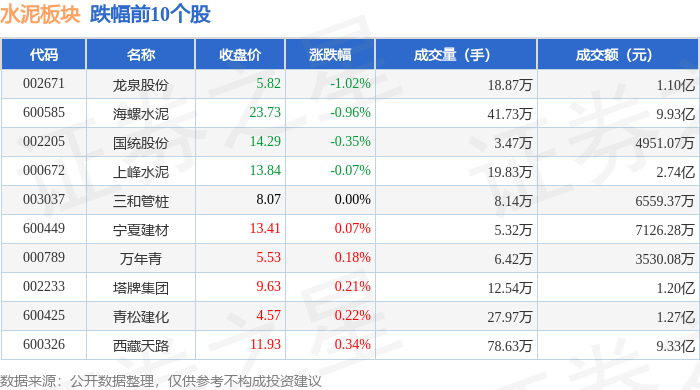 证券之星消息,1月23日水泥板块较上一交易日上涨0.4%,金隅集团领涨。当日上证指数报收于4136.16,上涨0.33%。深证成指报收于14439.66,上涨0.79%。水泥板块个股涨跌见下表: