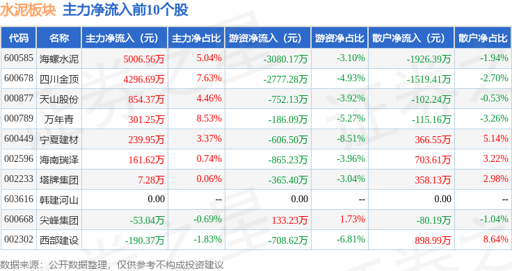 从资金流向上来看,当日水泥板块主力资金净流出1.69亿元,游资资金净流出1365.24万元,散户资金净流入1.83亿元。水泥板块个股资金流向见下表: