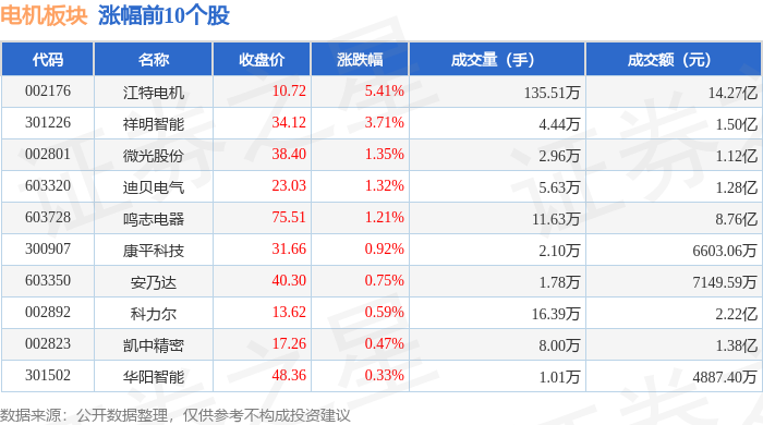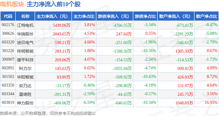 从资金流向上来看,当日电机板块主力资金净流出7.37亿元,游资资金净流出1.44亿元,散户资金净流入8.81亿元。电机板块个股资金流向见下表: