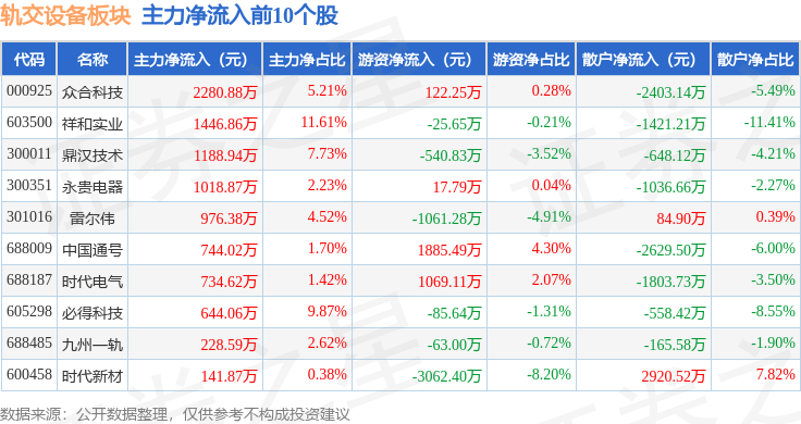 从资金流向上来看,当日轨交设备板块主力资金净流出6.59亿元,游资资金净流入2.64亿元,散户资金净流入3.95亿元。轨交设备板块个股资金流向见下表: